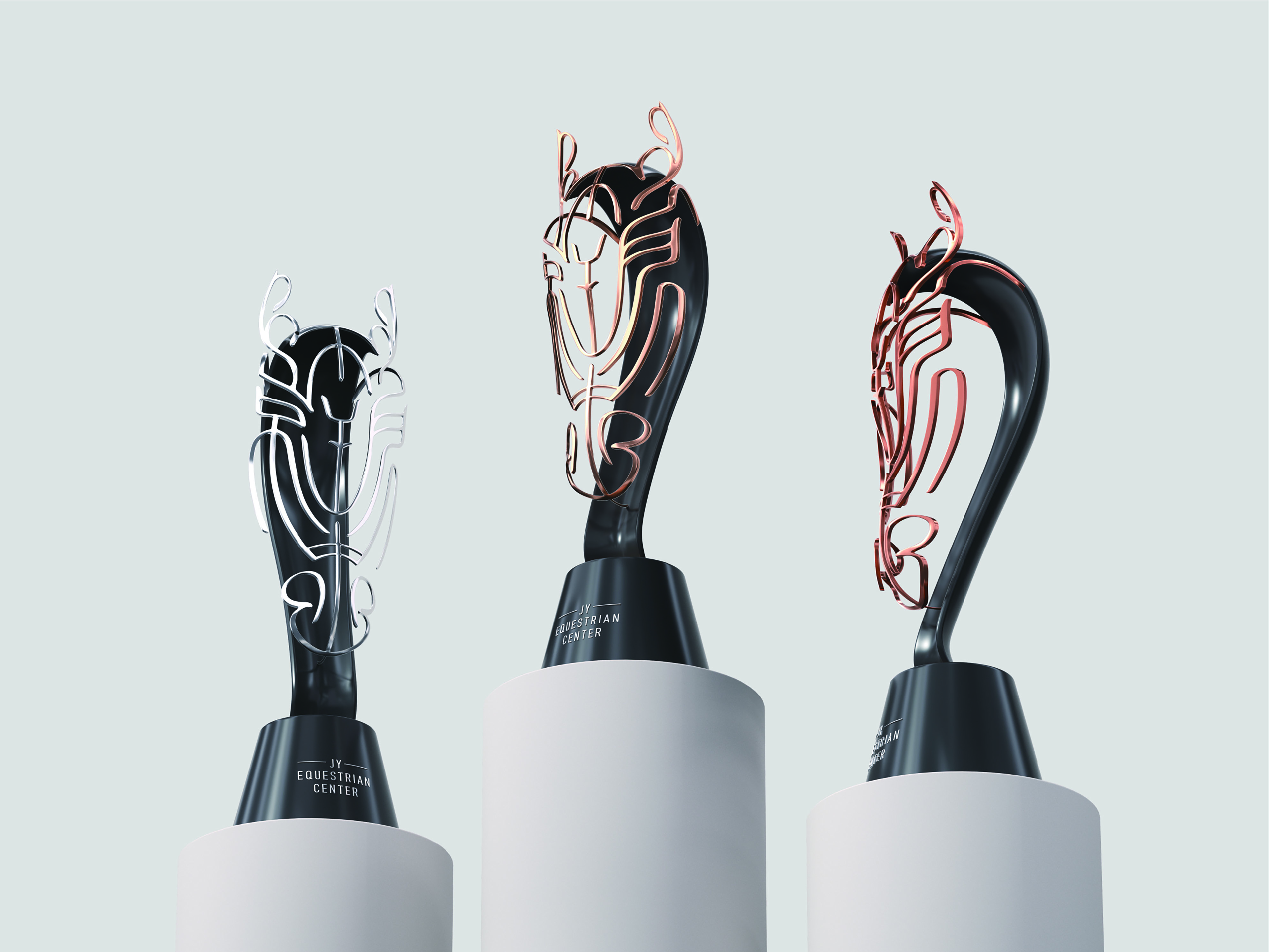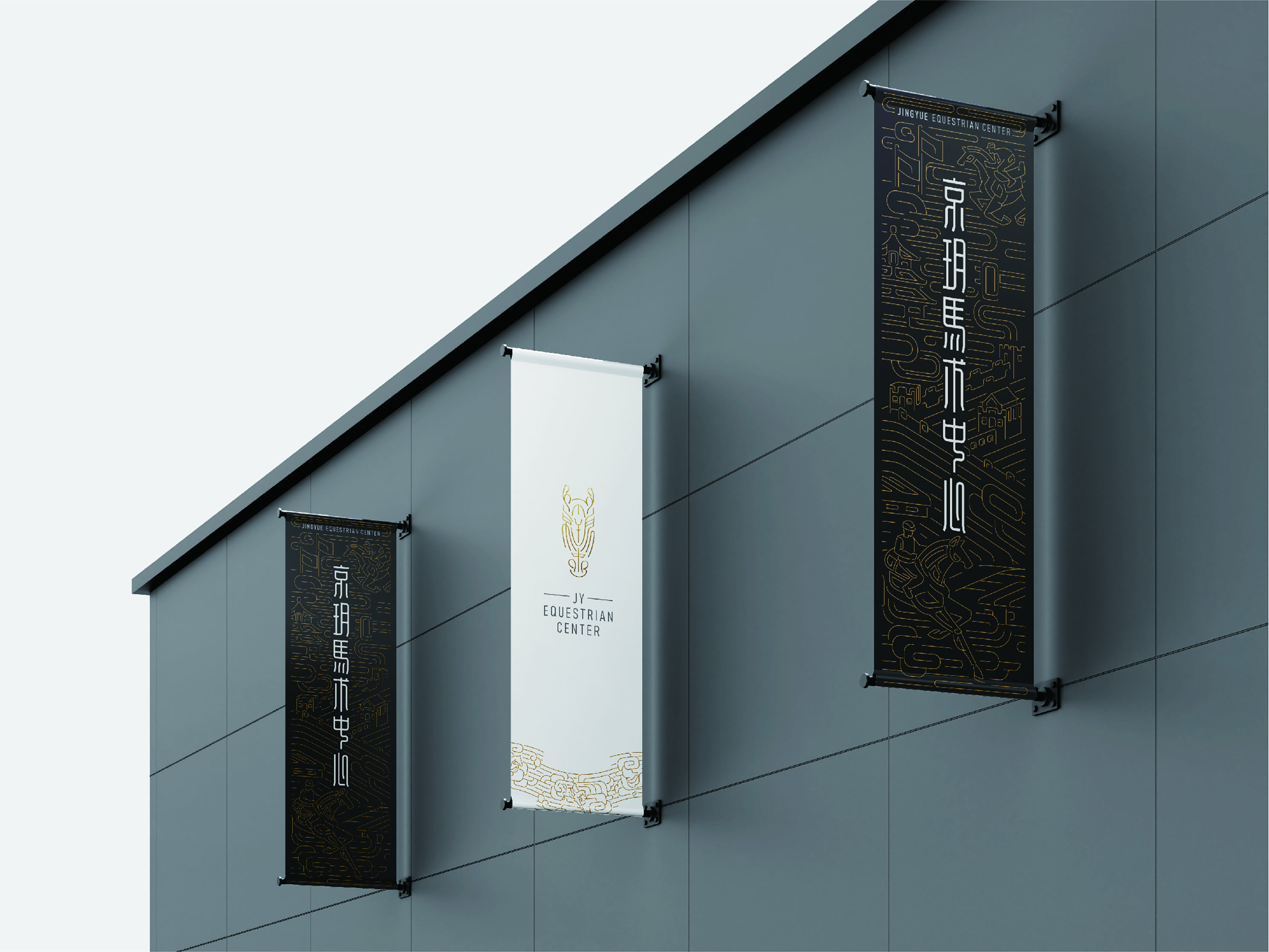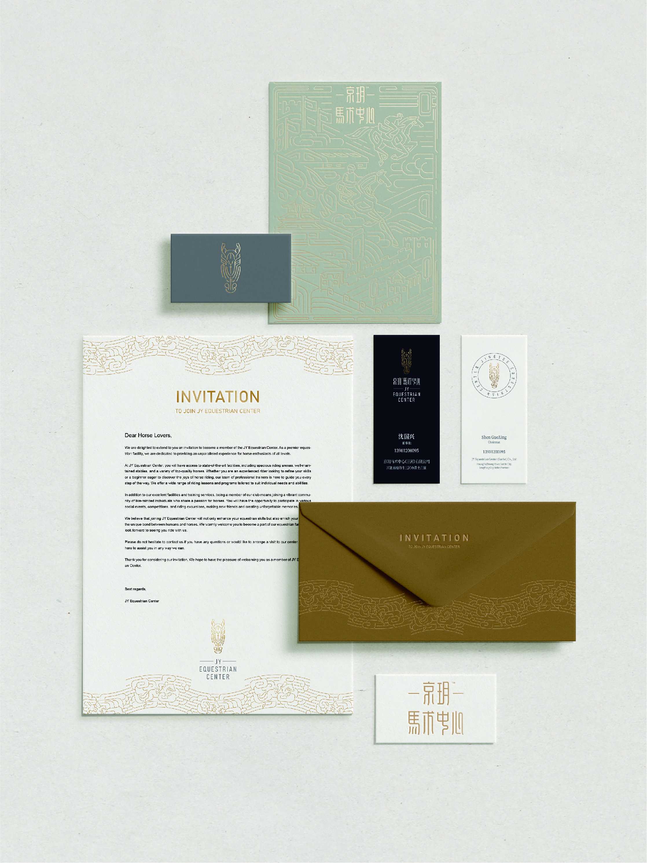 The design of the Jingyue brand identity is based on the equestrian animal imagery, with the “horse head seal” as its central symbol, reflecting the core principle of Jingyue Equestrian Center: “Merging East and West, Mastering Craft.” The creation focuses on cultural legacy and nature’s coexistence, blending historical regional traits, traditional Chinese seal script aesthetics, and the vitality of equestrian sports to form a visual identity rich in classical charm and imbued with the essence of Chinese spirit. This visual logo design is based on the seal script of the words “Jingyue” and “Center,” seamlessly incorporating the shape of a horse head seal to outline the horse’s face. The design captures a focused, poised expression, symbolizing a sense of strength and readiness to spring into action. It subtly reflects the spirit of self-control and pushing boundaries. Through the narrative structure of Chinese characters, the logo communicates the professionalism and human touch of Jingyue Equestrian Center. The design intricately integrates the natural brushstrokes of seal script with the ancient beauty of bronze textures. From a distance, the logo takes the shape of a horse-head totem, while upon closer inspection, it reveals a visual effect of deconstructed seal characters and bronze patterns. Such combination forms a unique brand mark that balances international visual appeal with hidden Eastern cultural significance. The gravitas of the seal aligns with the equestrian sport’s deep respect for rules, etiquette, and the promise to host world-class events.