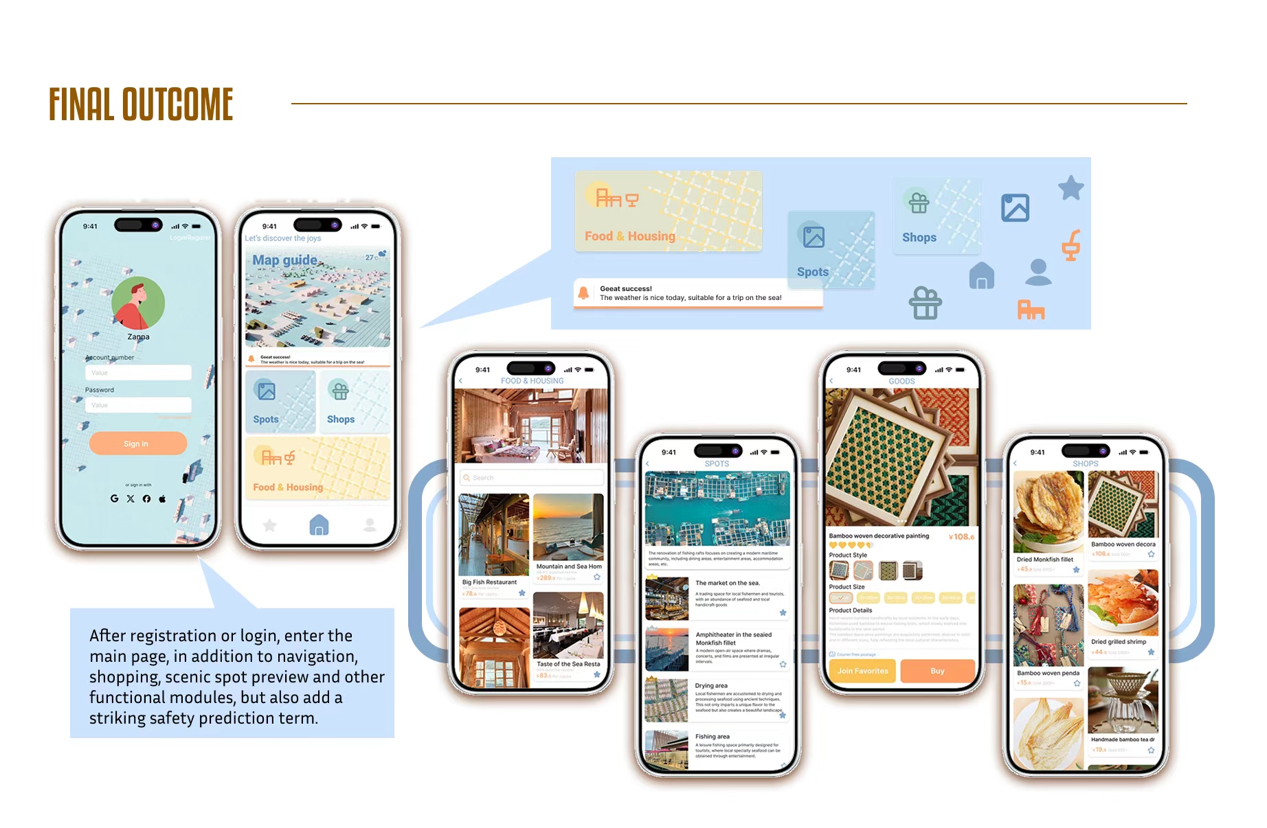 Inspired by the concept of a “Sea Village,” this APP is designed to enhance awareness and engagement with marine culture for both tourists and local residents. It integrates content on seafaring life—including clothing, food, housing, and transportation—and offers interactive, immersive experiences. By blending education with exploration, the APP fosters a deeper understanding of maritime villages and their cultural heritage.